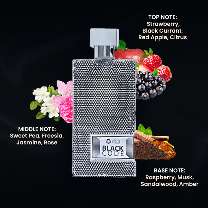 As you embark on the Black Code journey, the initial burst unfolds with the succulent sweetness of ripe strawberries, the bold allure of black currant, the crispness of red apple, and the invigorating notes of citrus. This top note symphony is your first-class ticket to an elegant olfactory experience.