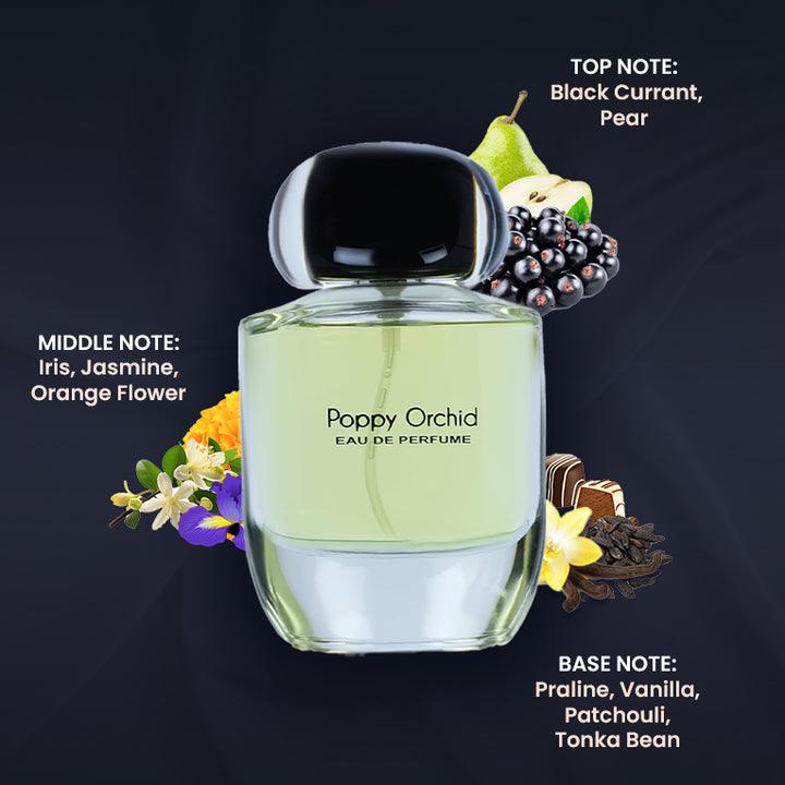 As the fragrance evolves, the base notes settle and linger. Praline and vanilla add a sweet richness, patchouli contributes an earthy depth, and Tonka Bean wraps you in warmth. The ashen and woody touch of Poppy Orchid's base notes offer a captivating and addictive trail.